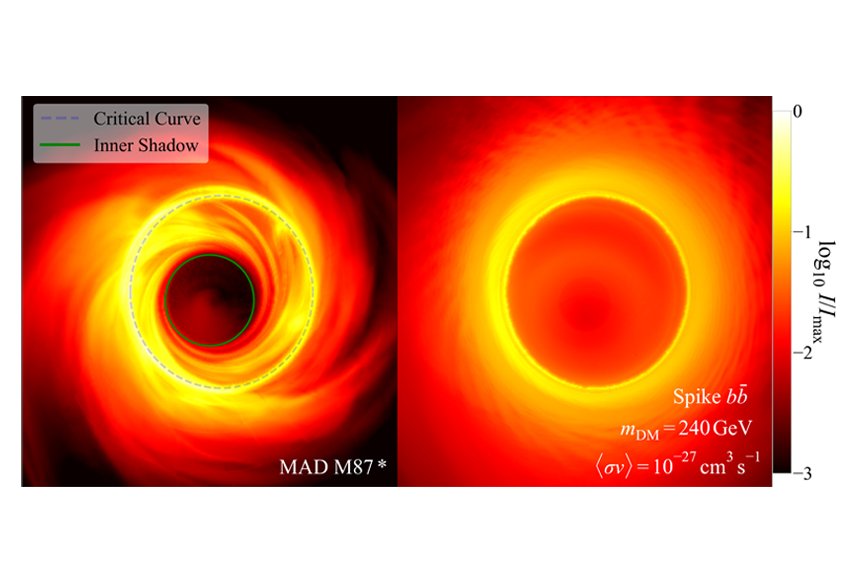 The EHT's images of the supermassive black hole M87* reveal a dark "shadow" encircled by a bright photon ring. The study shows that the faintest region of this shadow, the "inner shadow," shaped by light bending near the horizon, is especially sensitive to radiation from dark matter annihilation. Unlike ordinary plasma, typically expelled by jets, dark matter annihilation continuously injects electron-positron pairs, which radiate synchrotron light and illuminate this otherwise dark zone, as shown in the right panel of the figure above.